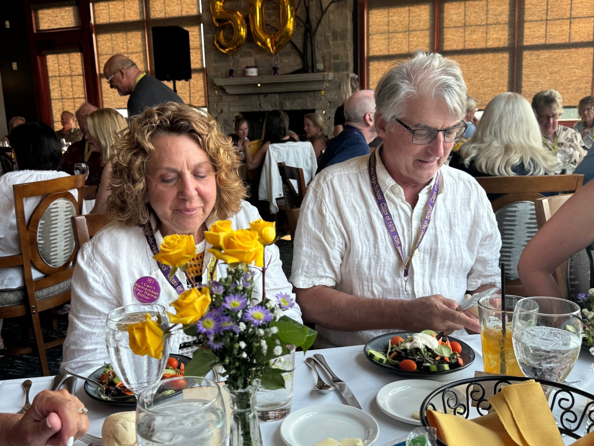 One of the beefs from the 40th Reunion Warm Up was classmates should have had name tags. Nope. Being bold and figuring out who is who is half the fun. For the 50th, classmates were appropriately pinned.